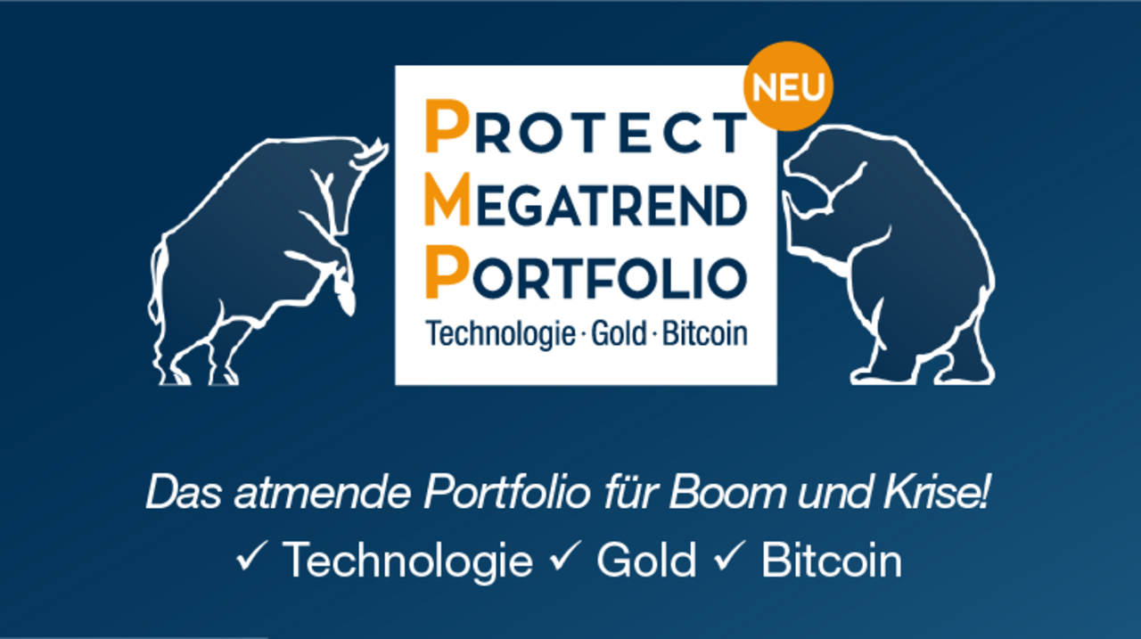 Das neue Protect-Megatrend-Portfolio (PMP) kombiniert Technologie, Gold und Bitcoin in Ihrem Depot! Dabei sind Sie hier immer in allen drei Assetklassen investiert – im Boom mit einem hohen Anteil Technologie und in der Krise mit einem hohen Gold-Anteil. Die Teilnahme ist bereits ab 10.000 Euro möglich, und ab 500.000 Euro genießen Sie mit PMP-PREMIUM zusätzlich alle VIP-Vorteile. Jetzt das einzigartige PMP zum Vermögensaufbau nutzen!
